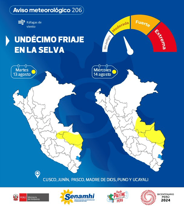 Un nuevo periodo de friaje, el undécimo en lo que va del año, se presenta en la Selva peruana desde hoy martes 13 al miércoles 14 de agosto y afectará por lo menos a 11 provincias de 5 regiones, advirtió el Servicio Nacional de Meteorología e Hidrología (Senamhi). De acuerdo